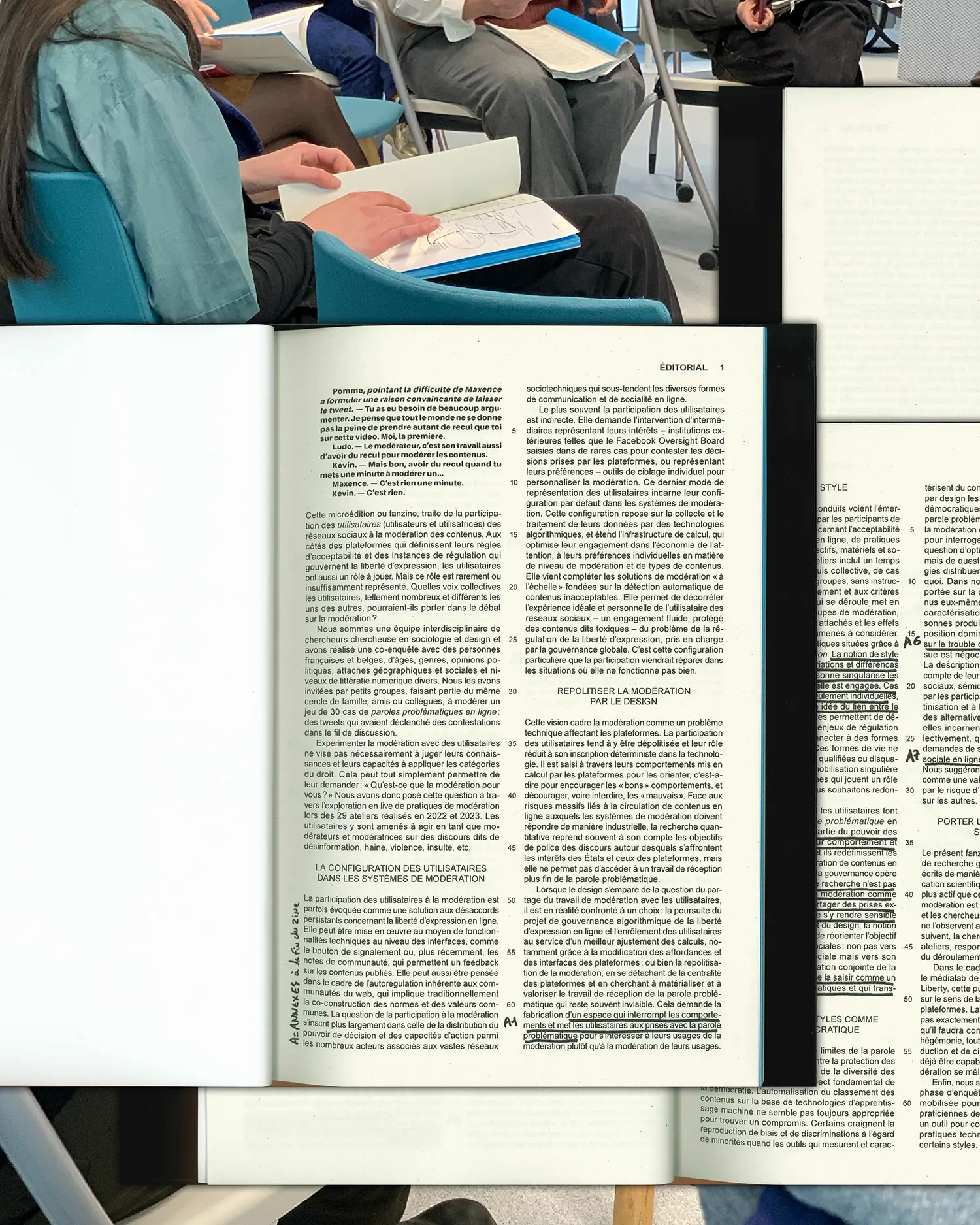 Dans la deuxième phase à venir du projet, cette microédition sera également mobilisée pour interroger d’autres praticiens et praticiennes de la modération. Elle est donc aussi un outil pour collecter et cartographier les objets et pratiques techniques liés à la modération de paroles problématiques en ligne. »