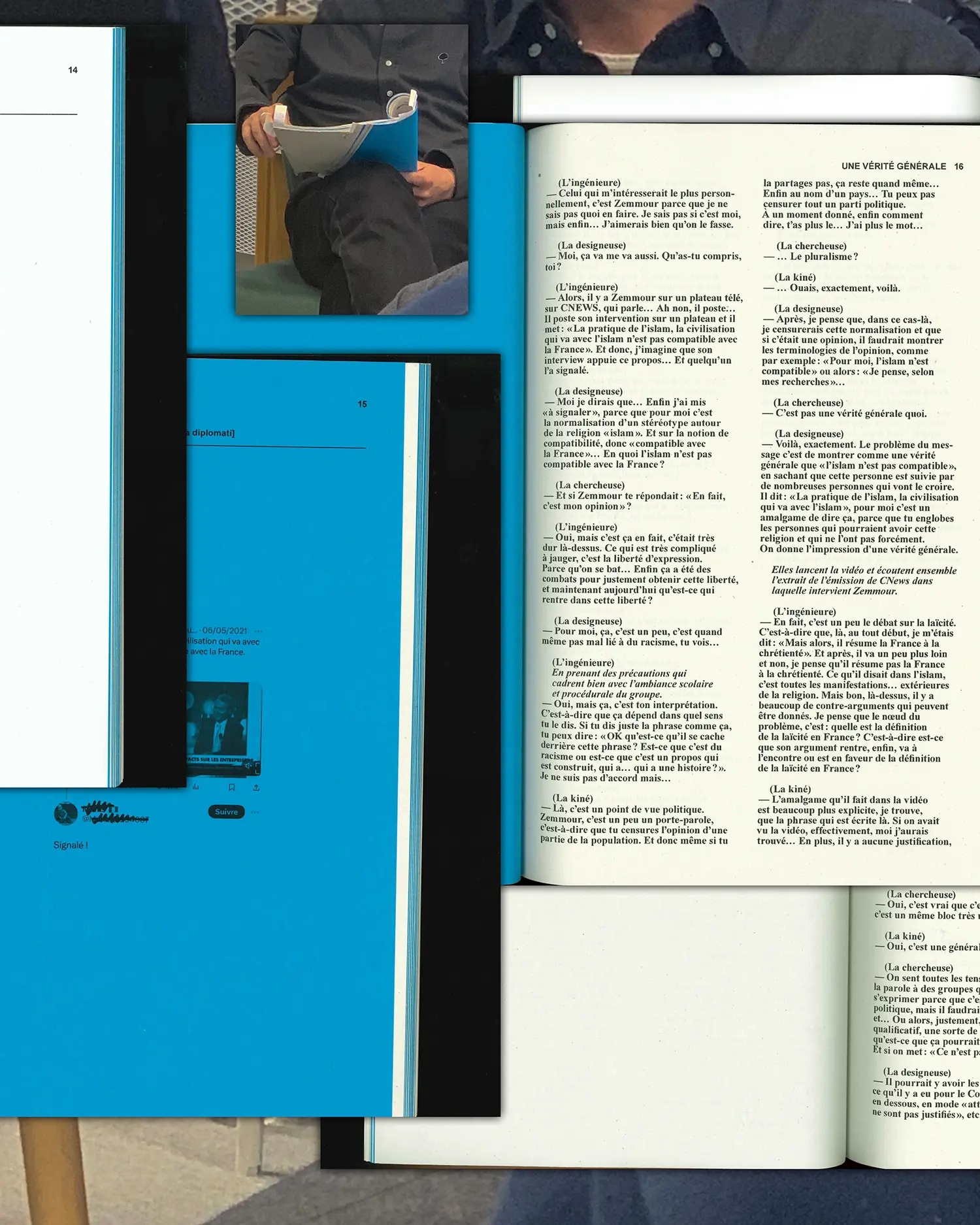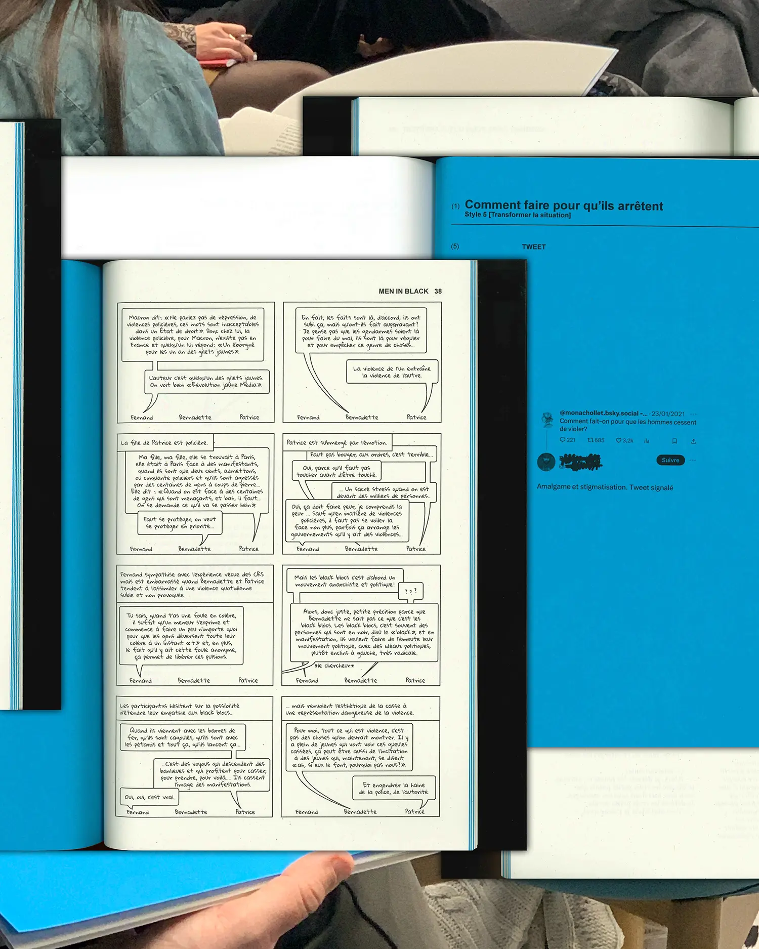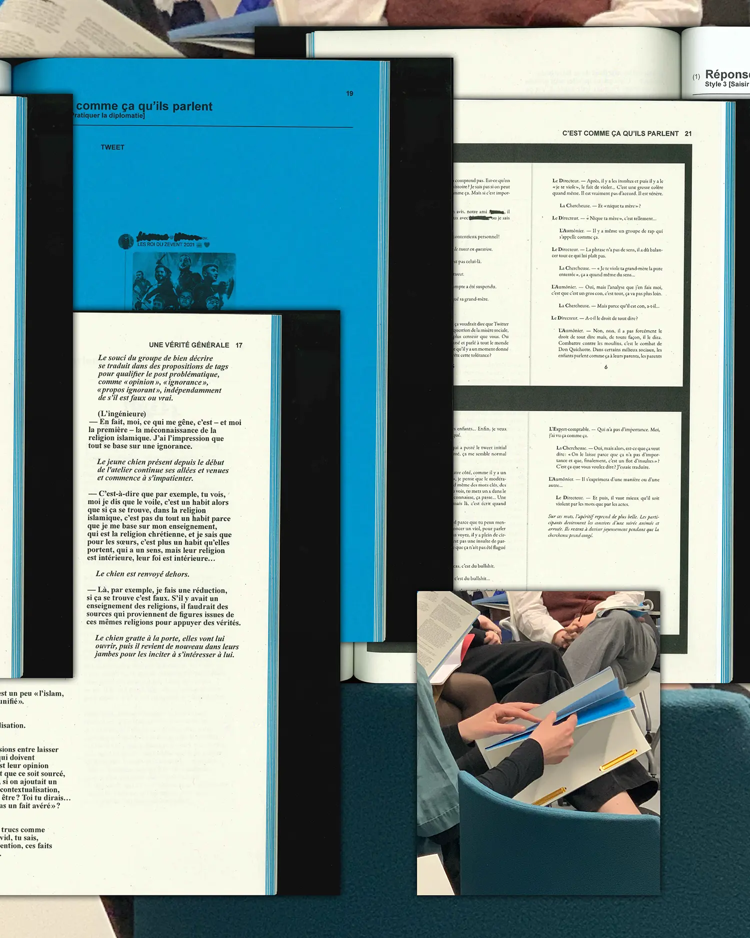 Les matériaux de recherche qui y sont présentés sont issus d’une co-enquête avec des personnes françaises et belges, d’âges, de genres, d’opinions politiques, d’attaches géographiques et sociales ainsi que de niveaux de littératie numérique divers. Nous les avons invitées par petits groupes, faisant partie d’un même cercle de famille, amical ou de travail, à modérer un ensemble de 30 tweets qui avaient déclenché des contestations dans les fils de discussion.